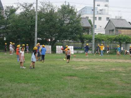 深江小学校では10年ほど前から校庭の全面芝生化を行っています。これは地球温暖化防止のための校庭緑化と皆さんが転んでもケガしにくいようにと、大阪市と地域の皆さまにお金を出していただいて取り組んできました。