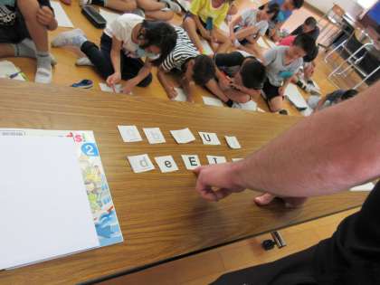 5年生の英語授業の様子です。今日の授業はアルファベットの大文字と小文字をネイティブの発音から聞き取って行うビンゴゲームです。