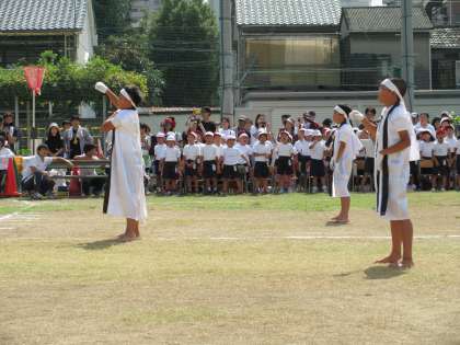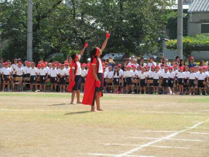 赤白の応援団のエールの交換で、運動会の午後の部がスタートしました。