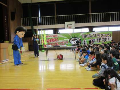 モデルに「ゆうかいするぞう」君が登場して、連れ去り犯の行動や対策を教えていただきました。知らない人についていかない、連れ去られそうになったら大声を出す、防犯ブザーを鳴らしましょう。最後に「助けてー」を講堂中に鳴り響く大声で発声しました。