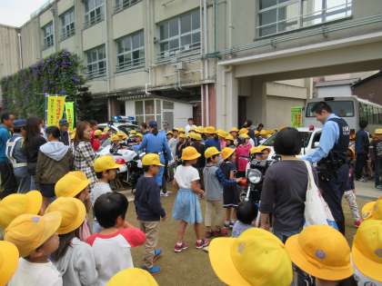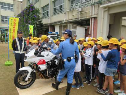 パトカーや白バイ、青バイを間近で見ることができて、児童の目は釘付けになっていました。特に、白バイ隊員のかっこよさに憧れを持ったようです。
