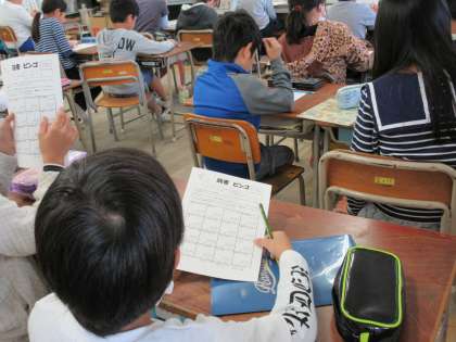 お楽しみは何かな?先生のお話を聞いている4年生の児童たちです。
