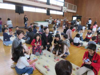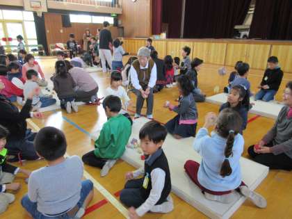 お手玉を1・2年生が教えてもらっています。なかなか難しいようですが、手遊びを通じて、様々な感覚の訓練になっています。むかしの遊びは感覚づくりに役立っていましたね。