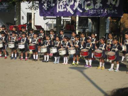 第10回の深江歴史・文化まつりのオープニングセレモニーが深江南公園で開催されました。深江小学校4年生による開会宣言のあと、深江幼稚園の鼓笛隊のみなさんの演奏です。
