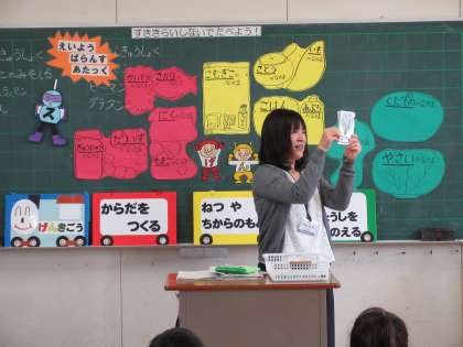 1年生の栄養学習です。今日のテーマは「すききらいしないでたべよう!」です。