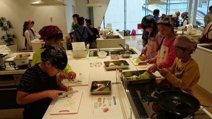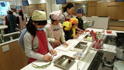 調理実習が始まりました。みんなで説明を聞いて、手分けして作業を進めています。グループで協力しておいしく調理できるよう頑張ります。