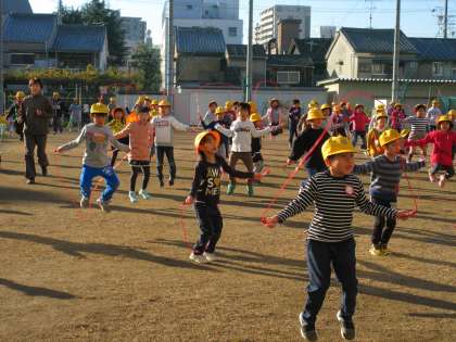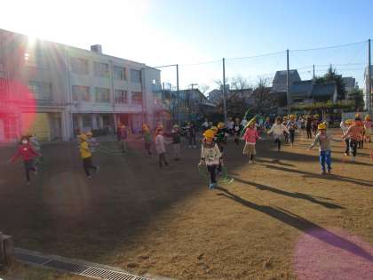 朝の光を浴びて、始業時前になわとびに取り組む低学年の児童です。