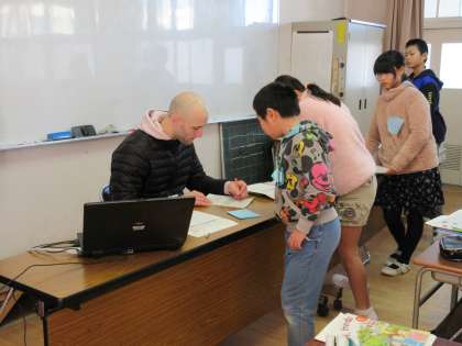 ミニテストの日です。不安そうにテストの採点を見つめている5年生です。(ベン先生)