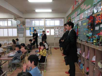 教育委員会や教育センターの担当の先生、各学校からも先生がお見えになっていますが、1年生はいつも通りの学習の成果を発表できました。