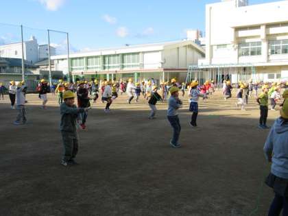 早朝のなわとび集会の様子です。寒さに負けずになわとびを頑張る低学年たちです。
