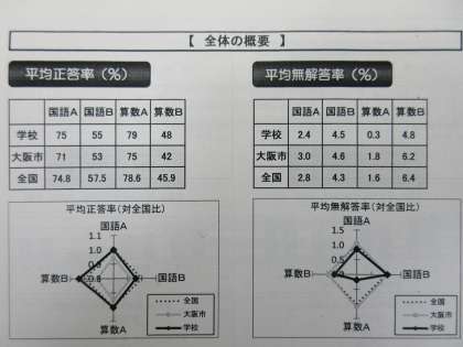 国語A・B、算数A・Bとも大阪市平均を大きく上回り、国語Bを除いては全国平均も上回っている結果となっています。特に算数Bは全国平均を大きく上回っています。