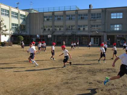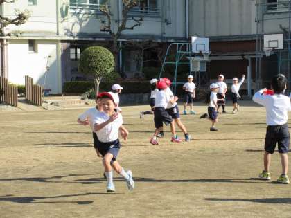 学年での体育です。グラウンド狭しと元気に駆け回っています。