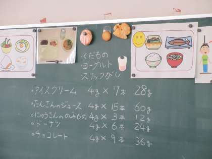 おやつに含まれる砂糖の量や、高カロリーなおやつを食べると体にどのような影響があるかをわかりやすく教えていただきました。炭酸飲料やチョコレートなどに多くの砂糖が使われていました。