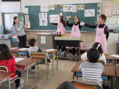 先日の3年生に続いて、東成区の保健福祉課栄養指導員、食生活改善推進協議会の皆さまをお招きして、2年生が栄養教育の特別授業を受けました。