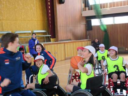車いす操作やパス、シュートなどを教えてもらっています。