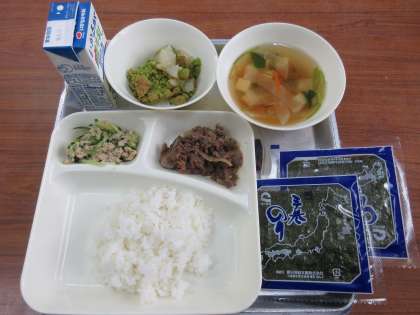 こんだて:手巻きご飯(牛肉の甘辛煮、ツナソテー)、すまし汁、和なしの抹茶クランブル、米飯、牛乳