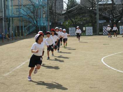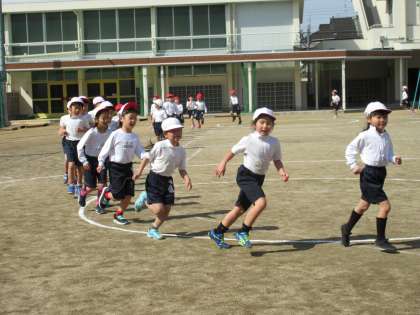 1組・2組合同での体育の授業です。準備体操の後、グラウンドをランニングしているところです。