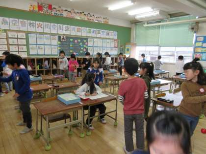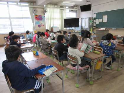始業時前は、校庭でよく遊ぶ深江小学校の児童たちですが、本日も昨日来の雨で校庭が使用できなくなり、各クラスで読書をしたり、自習やけん玉の練習をしている児童たちの様子です。(写真は1・2年生です。)