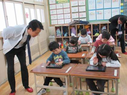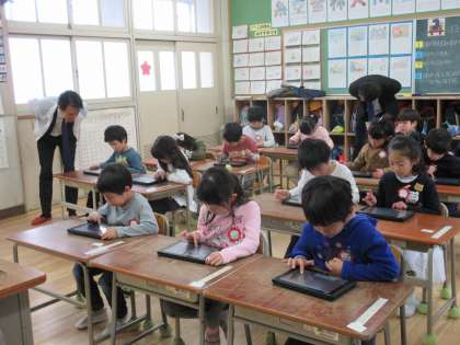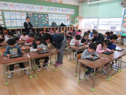 今日は麻野東成区長をはじめ、担当課長、係長もご参観にお見えになりました。最初は緊張した様子の1年生たちでしたが、「プログラミン」が始まるといつものように思い思いの動きをタブレットに入力し始めました。