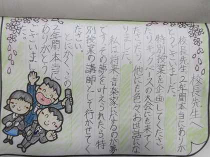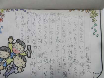 卒業まであとわずかとなった6年生全員からお世話になった教職員一人一人に感謝のお便りをいただきました。学校長がいただいたお便りを掲載します。短い文章ですが、感謝の気持ちがよく表れています。