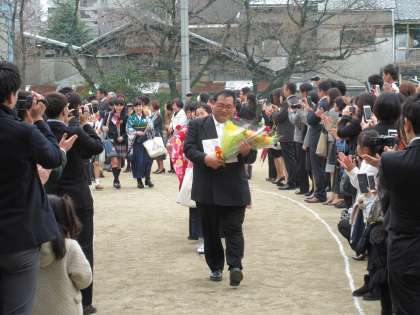 5年生と保護者、PTA役員、教職員が作った花道を担任を先頭に6年の児童が学校を後にします。6年間お世話になったこの校舎ともお別れの時です。「みなさん夢と希望を持って、未来に羽ばたいてください。」