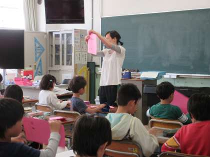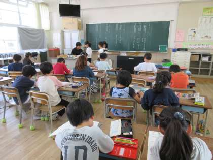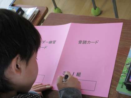 新2年生はさすがです。先生のお話をしっかり聞いています。新3年生はこれから使う音読カードの表紙などを担任の指示に従って作っています。