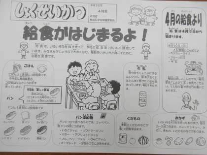 今日から給食が始まります。詳しくは学校からのおたより「しょくせいかつ」をご覧ください。ごはんは1週間に3回程度です。お米は青森産「つがるロマン」というお米を使っています。パンは1週間に2回程度です。種類は7種類で、コッペパン、食パン、ライ麦パン、レーズンパン、パンプキンパン、黒糖パンに今年度から「おさつパン」が加わりました。