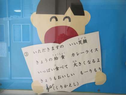 児童の好きな献立No.1はいつの時代も「カレーライス」です。今日はご入学のお祝いこんだてとして「カツカレーライス」です。