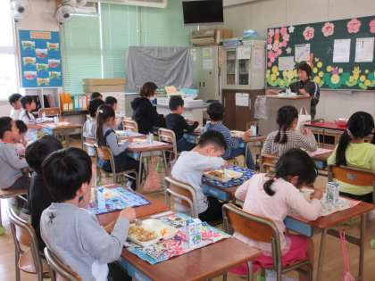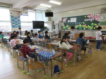 楽しみにしていた給食の時間です。みんなで「いただきます」をしてから大好きなカレーライスをいただきます。