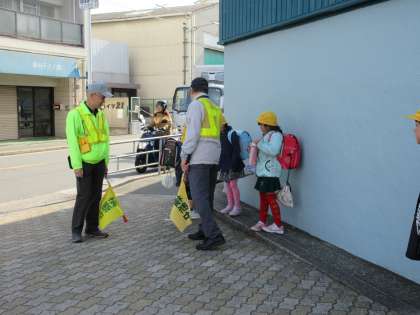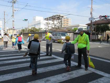 いつも、登校する児童の安全を見守っていただいている深江地域の見守り隊の皆さまです。校区内の交差点の要所に多くの皆様に見守りをいただいています。