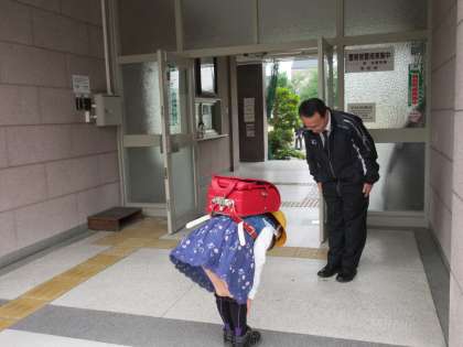 毎朝、正面玄関で校長先生と朝のごあいさつをして、学校に登校します。