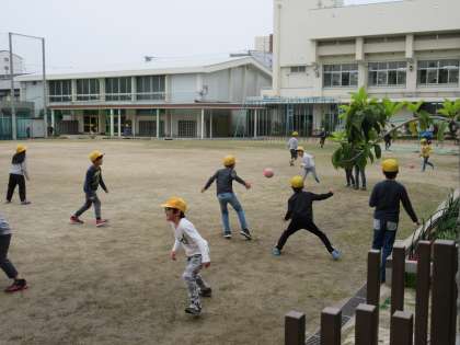 早く来た児童は校庭で元気にドッジボールをしています。「がんばれ!深江っ子」