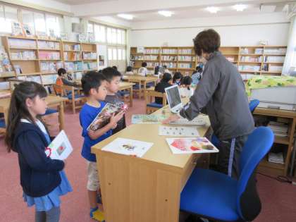 1年生が図書館学習をおこなっています。本の貸し出しや返却の仕方を担任から教えてもらっています。リニューアルされたばかりの新しい図書館で、これからたくさんの本を読みましょう。「本は友だち、心の栄養です。」(学校長)