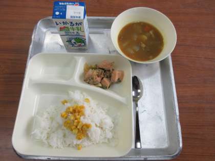 こんだて:サケのチャンチャン焼き、トウモロコシご飯、スープカレー、米飯・牛乳