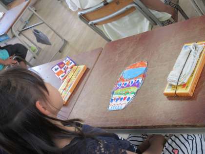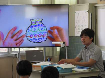 壺のデザインを考えています。大型画面を活用してクラス全員で工夫しています。このような場面ではICTの活用がわかりやすいですね。