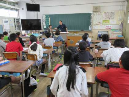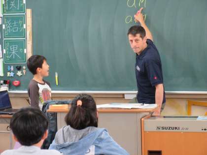 4年の外国語活動です。1〜4年の外国語活動を行うのは、元AET(英語指導助手)のマット先生です。本校では1〜4年生の全クラスで外国人講師の英語授業を行っています。(マット先生には昨年度から引き続いてご指導をいただいています。)