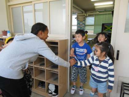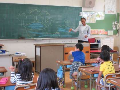 1組に続いて2組の様子です。自己紹介のあと、ジャマイカの自然や食べ物、美しい鳥の紹介がありました。湖と海がつながっているBlue Hole(ブルーホール)のお話には興味深々だったようで、質問が相次ぎました。最後は、お別れをしましたが、「また来てねー」とお別れを惜しんで、職員室まで見送りに来た児童もいました。