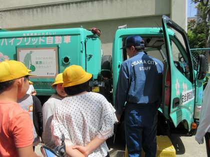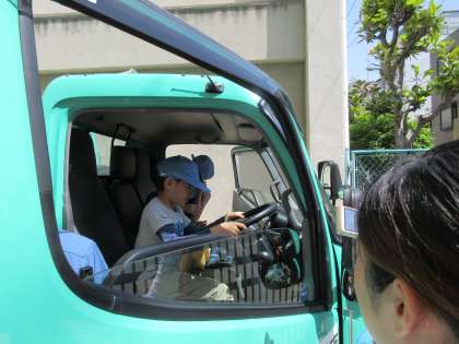 実際にパッカー車に試乗させていただきました。ハンドルを握ってご満悦の4年生たちでした。