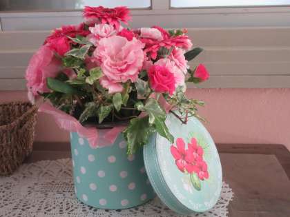 (写真:アートフラワー教室の作品です。「いつもきれいなお花をありがとうございます。」)