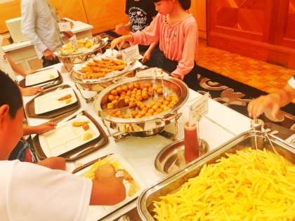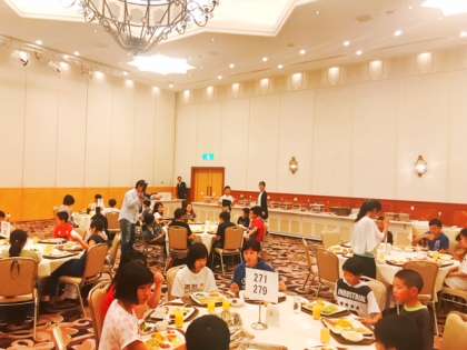 そのあとは、お楽しみの夕食です。グループで着席。バイキング料理をいただきます。