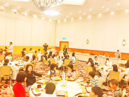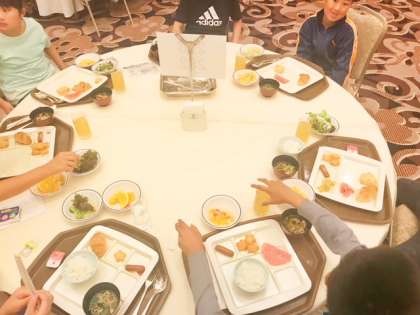 朝食も夕食同様バイキング料理です。みんな朝からモリモリ食べています。