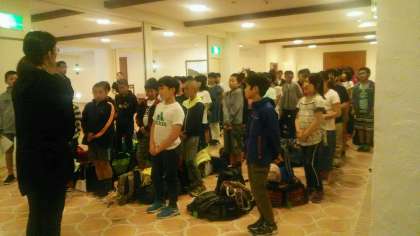 来た時よりも美しく。みんなで協力して後片付けをし、退舎式をしました。楽しいホテルでのひと時も終わり、次はもくもく手作りファームに向かいます。