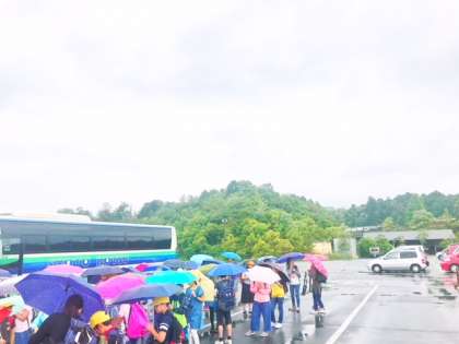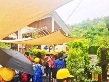 もくもく手作りファームに到着。あいにくの雨ですが、みんな元気に到着です。