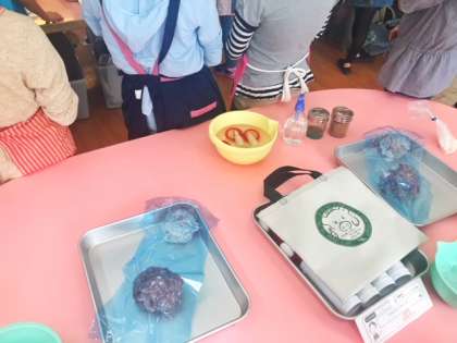昼食を終えて、次のプログラムの「ソーセージ作り」に挑戦です。ソーセージはほとんどの人が食べたことがありますが、作ったことがある人はほとんどいないかもしれませんね。材料や味付けした豚肉を詰める用具などいつもは見たことがないものもありますね。