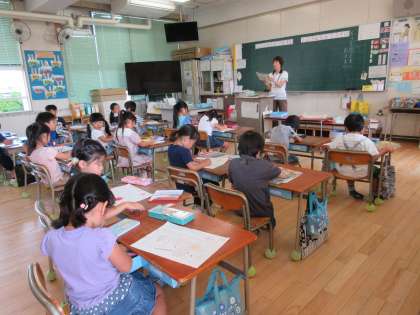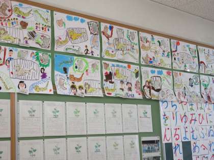 授業の様子と学級の掲示です。「遠足で動物園へ行ったときの楽しそうな様子が描かれています。」