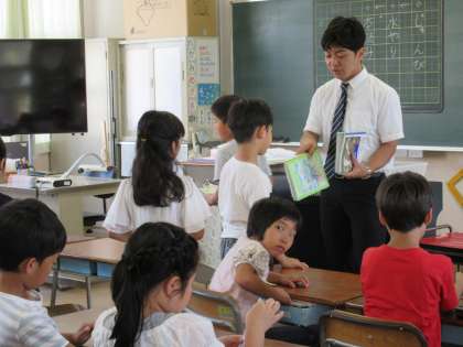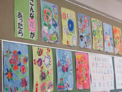 授業の様子と学級の掲示です。「美しい花が描かれています。みなさんとても上手です」