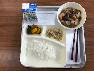 献立:すき焼き煮、焼きかぼちゃの甘みつかけ、もやしのごま酢あえ、ごはん、牛乳