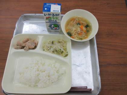献立:鶏肉のしょうゆマヨネーズ焼き、五目汁、きりぼしだいこんのゆずの香あえ、米飯・牛乳