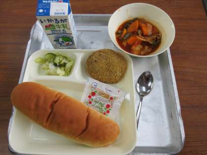 献立:チキンレバーカツ、ケチャップ煮、キャベツときゅうりのサラダ、パン・牛乳