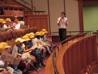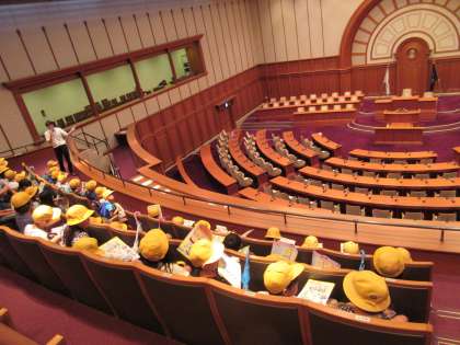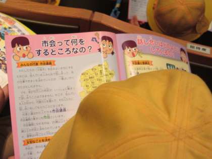 市会議場をご案内いただきました。これから改修工事が入るそうで深江小学校の3年生が最後の見納めになりました。とても立派な議場に驚いた3年生たちです。高さは10mで、教室16個分の広さがあるそうです。とても35年経っているとは思えませんね。